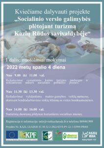 Pareiškėjas VšĮ Kazlų Rūdos turizmo ir verslo informacijos centras įgyvendino projektą “Socialinio verslo galimybės plėtojant turizmą Kazlų Rūdos savivaldybėje“ Nr. KAZL-LEADER-1C-M-12-2-2022/42VS-PV-22-1-03909-PR001, pateiktą pagal Sūduvos VVG kvietimą Nr. 12. Vykdytas mokymų projektas, kurio tikslas – pristatyti socialinio verslo galimybes organizuojant teorinius ir praktinius mokymus Kazlų Rūdos savivaldybėje veikiantiems turizmo paslaugų tiekėjams bei vietos NVO. Socialinio verslo modelio taikymas turizmo versle yra gana retas reiškinys, dėl žinių ir informacijos stokos vengiama eksperimentuoti ir į verslą pažvelgti šiek tiek kitu kampu. Įgyvendinant šį projektą planuojama pristatyti socialinį verslą kaip galimybę turizmo paslaugų tiekėjams. Šiuo tikslu organizuojant teorinius ir praktinius mokymus dalyviams bus pristatoma bendradarbiavimo su vietos bendruomenėmis ir NVO sektoriumi nauda, vietos pranašumų ir turimų išteklių panaudojimo galimybės sprendžiant vietos problemas bei vykdomo verslo tvarumo užtikrinimo perspektyvas. Projekte dalyvavo 15 vietinių turizmo paslaugų tiekėjų ir bendruomenių atstovų, kurie įgytas teorines ir praktines žinias planuoja pritaikyti versle ar vykdant projektinę veiklą bei taip prisidėti prie naujų darbo vietų kūrimo Kazlų Rūdos savivaldybėje. Projekto įgyvendinimo metu surengti 8 mokymai (teoriniai ir praktiniai) bei vienas renginys.